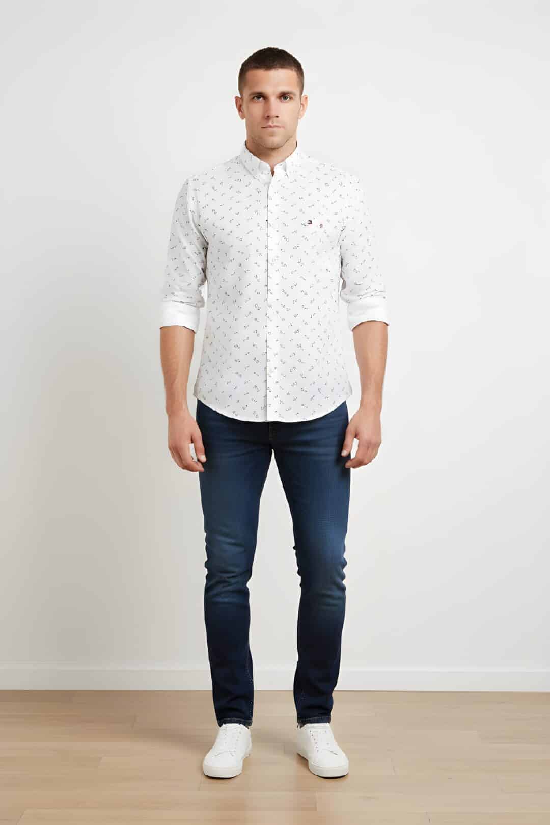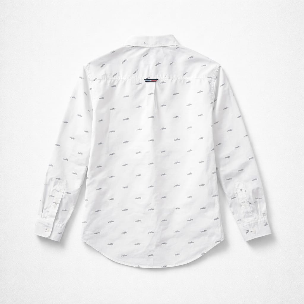 Colletto botton down, polsini con bottone, fondo camicia arrotondato, bandierina brand ricamata su petto.