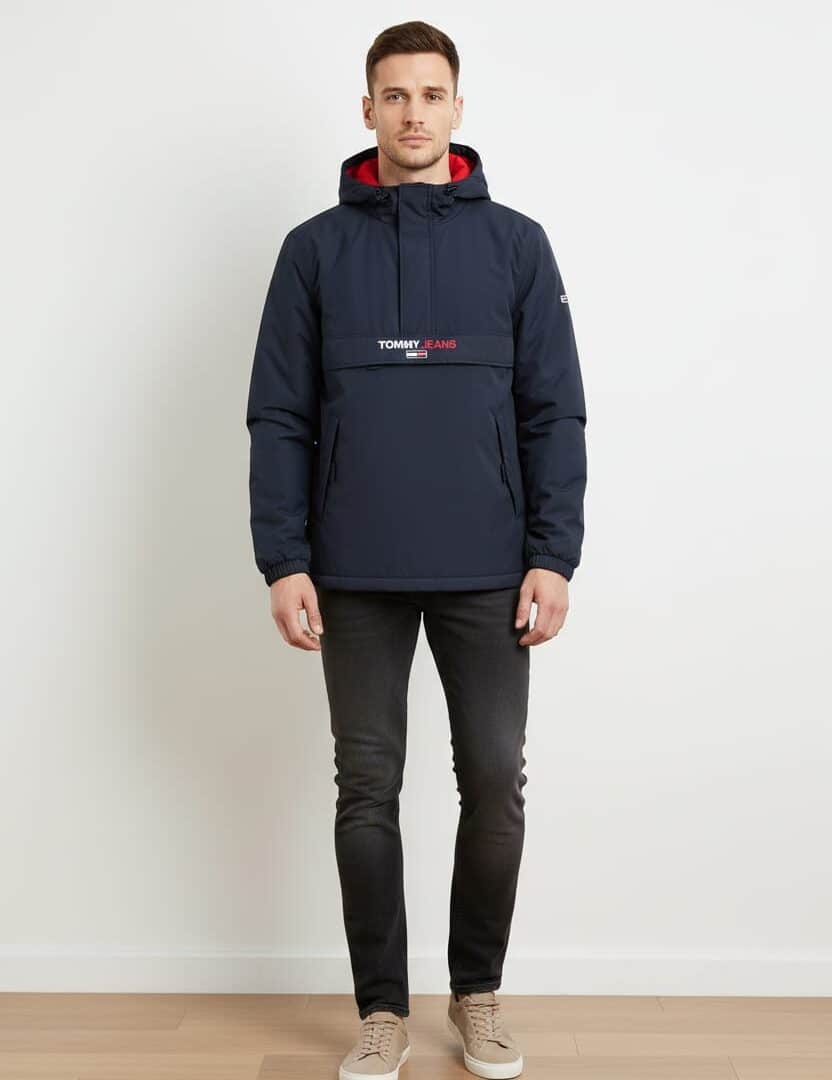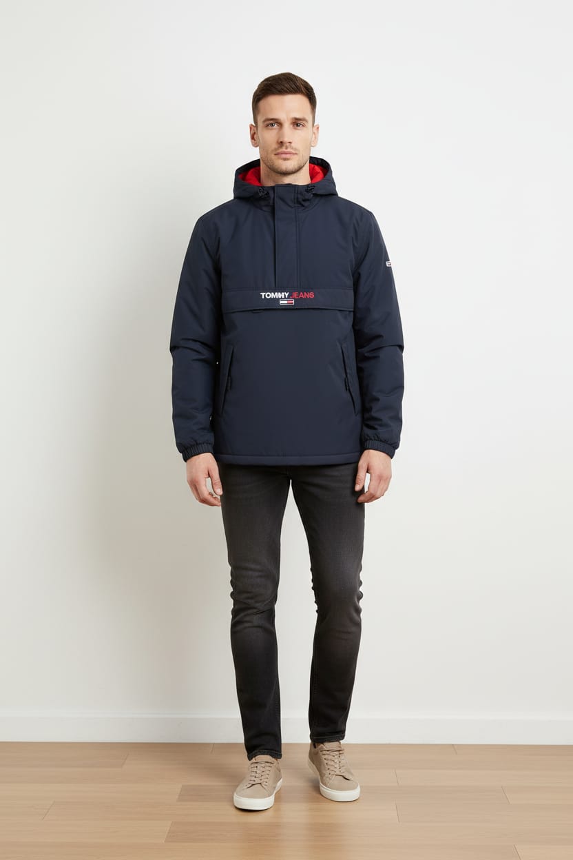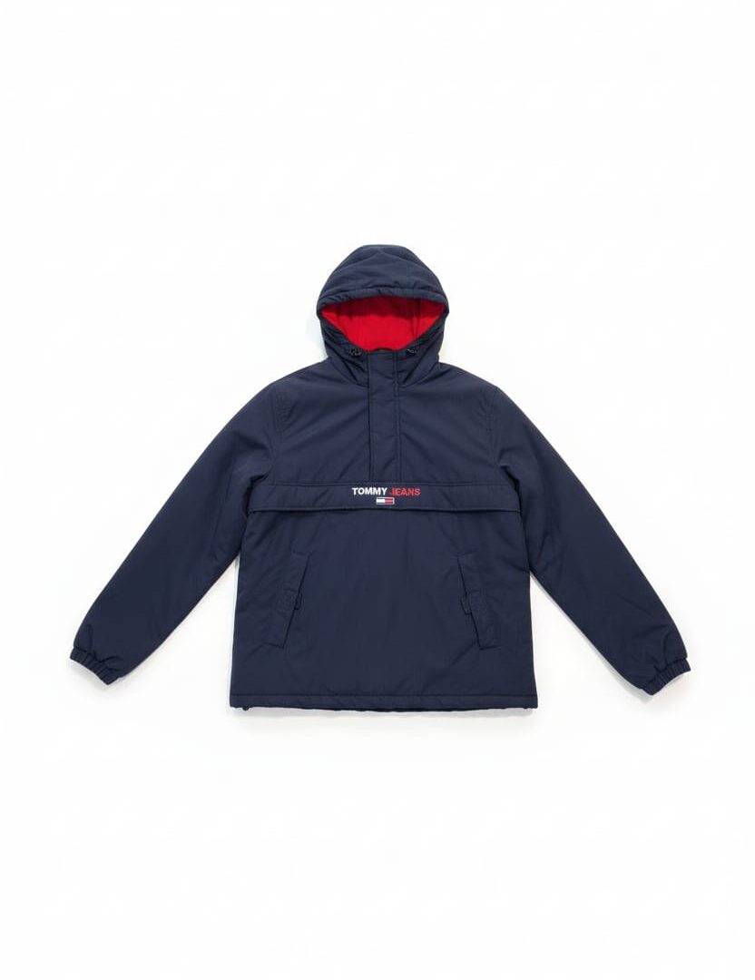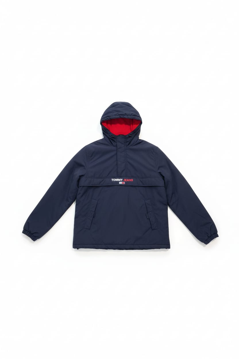 Giubbino uomo con cappuccio. Chiusura laterale con zip. Tasca a marsupio su torace e due tasche laterali con chiusura a velcro. Interno in pile color rosso.